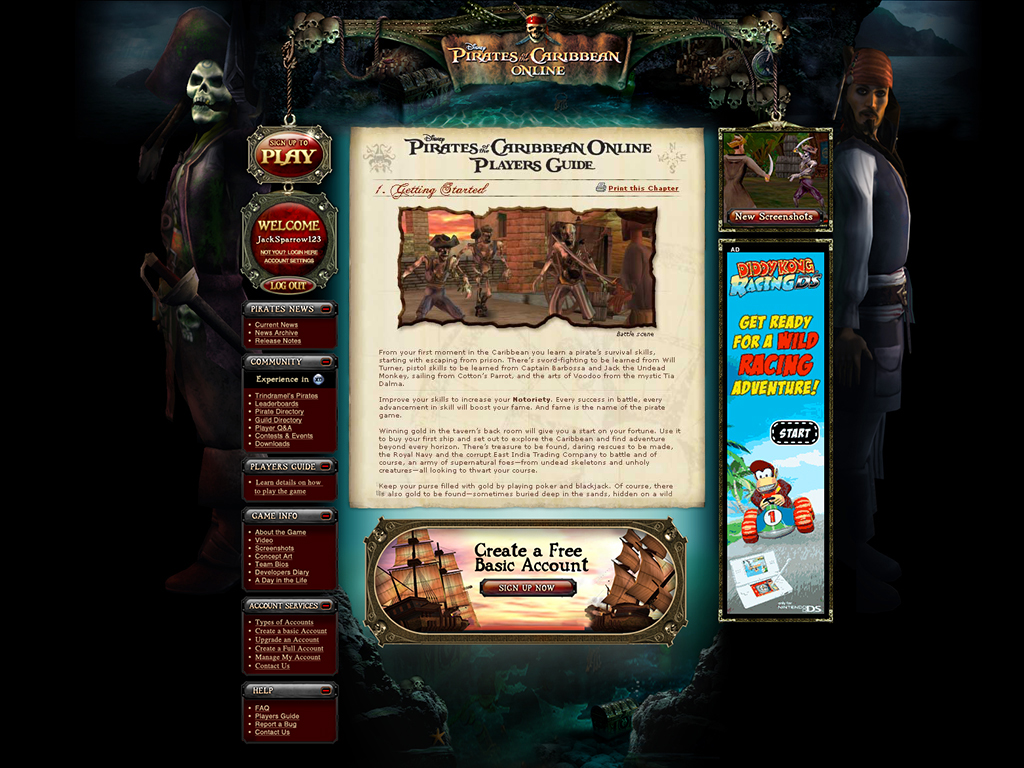 - Designing, illustrating and animating for Disney Connection, Toontown and Pirates of the Carribean properties. Tasks included animating and designing Flash game promos, marketing websites, print graphics for affiliate telecommunications companies (Comcast, Verizon, and Adelphia). Building and designing 100 page players’ guide for Pirates of the Carribean Online.