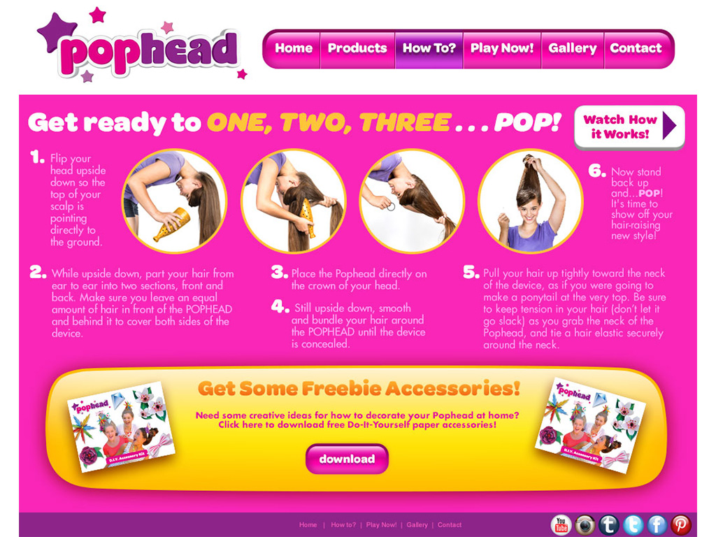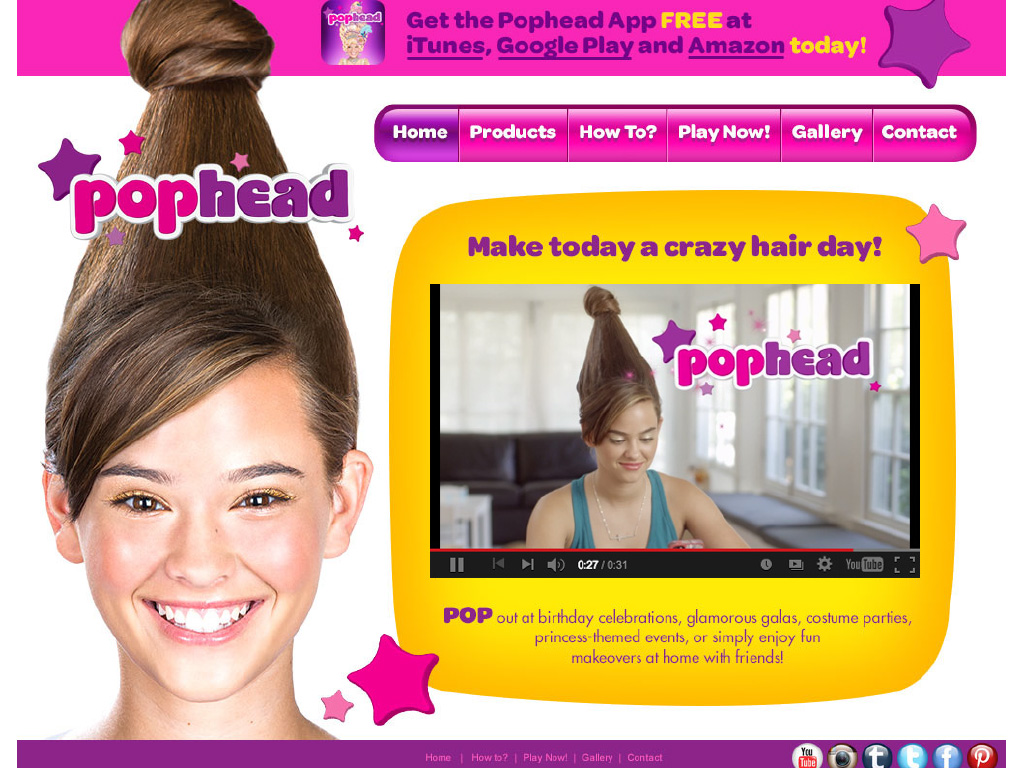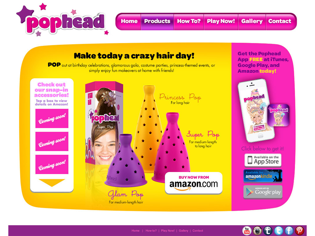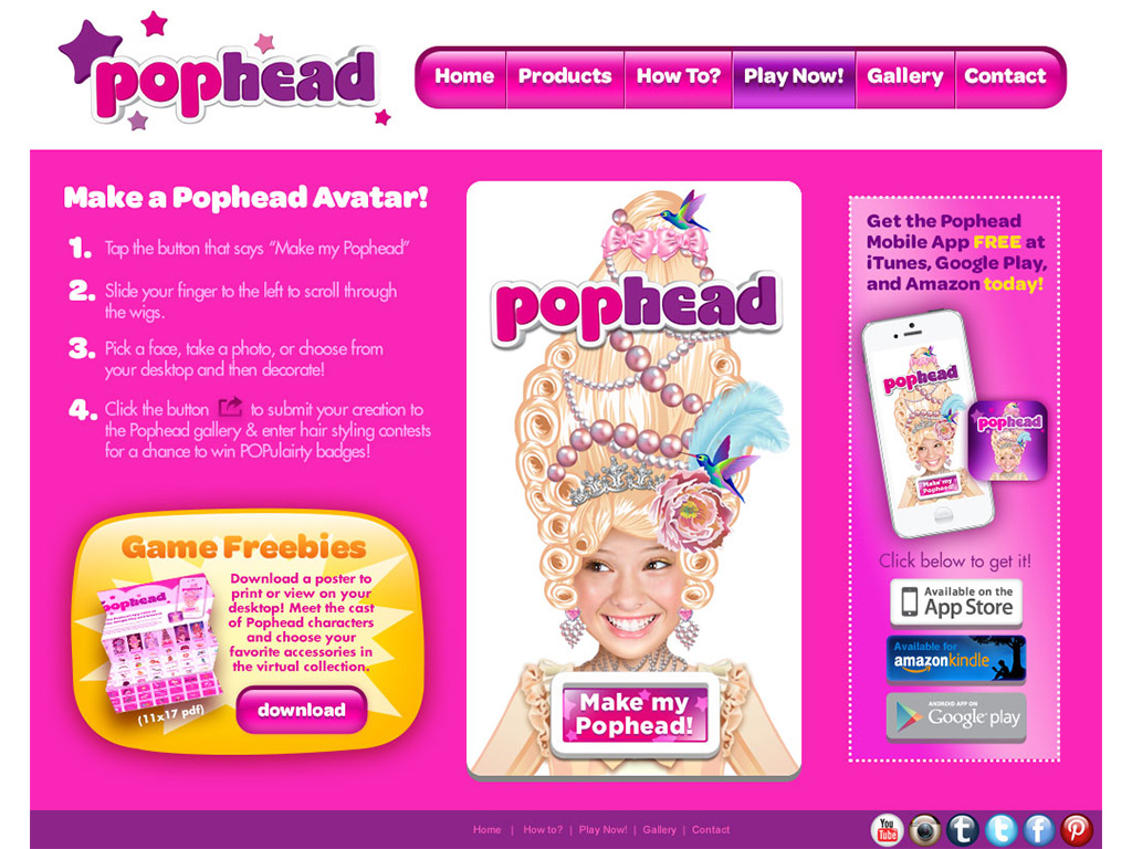 Pophead was an illustration heavy app where I designed 8 themed styles of "High Hair" that a user could accessorize and put his or her photo into. Pophead was a product that made your hair tall. I designed and produced a website for the product and designed a printout accessories activity book for the website as well. This project was a blast to work on.