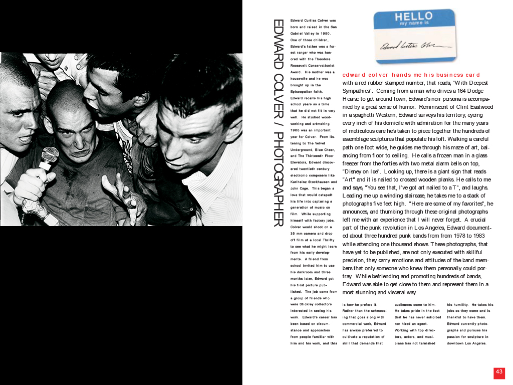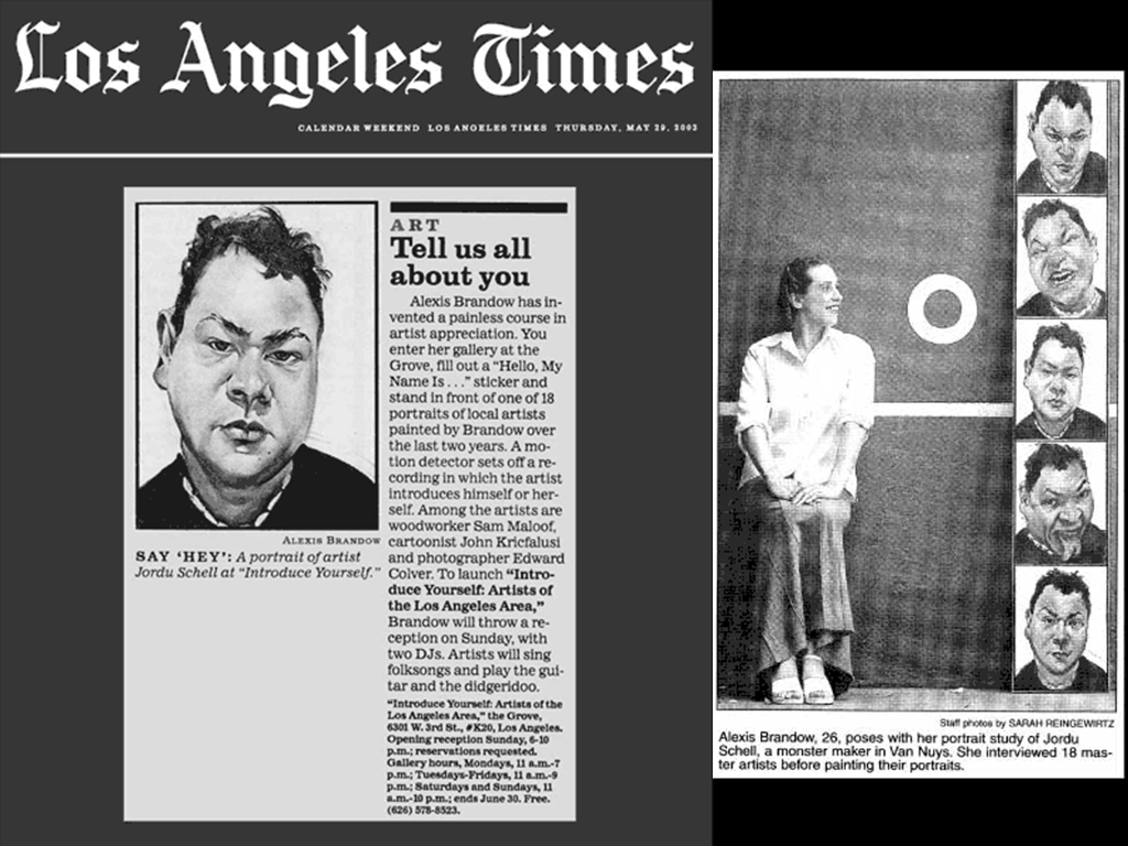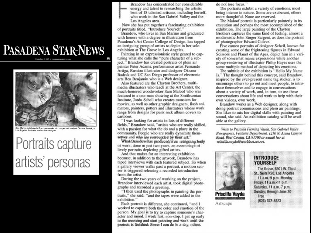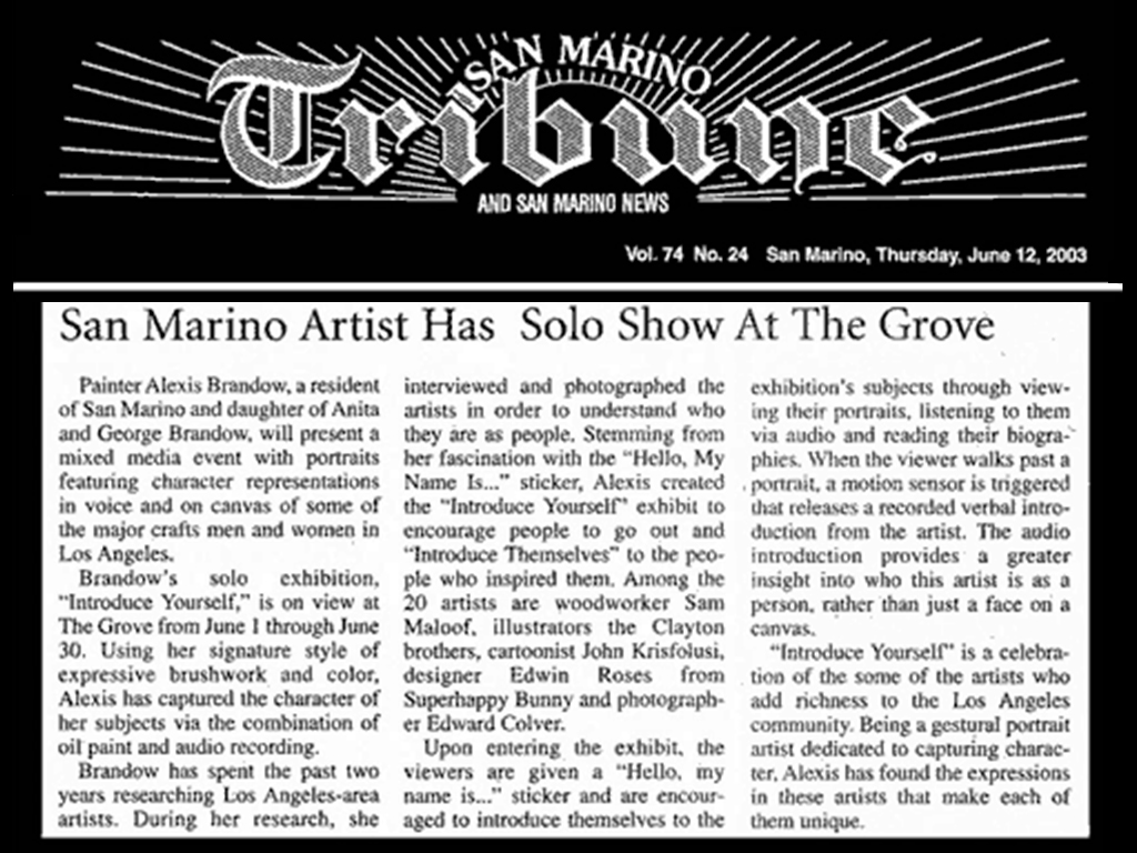 Introduce Yourself was an interactive exhibition combining traditional portraiture and soundscape, clebrating eighteen master artists from the Los Angeles area. Each portrait had a box next to it that had a motion sensor that, when triggered, the viewer would here the artist introduce his or herself. The show took place at The Grove which was and is a heavily trafficked outdoor shopping mall in West LA. I also made a detailed book that featured a famous piece of art from each artist, his or her portrait, and a small biography.