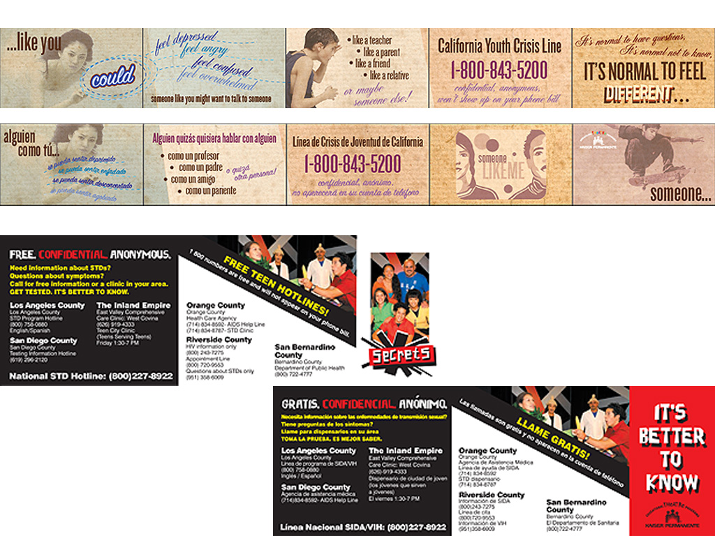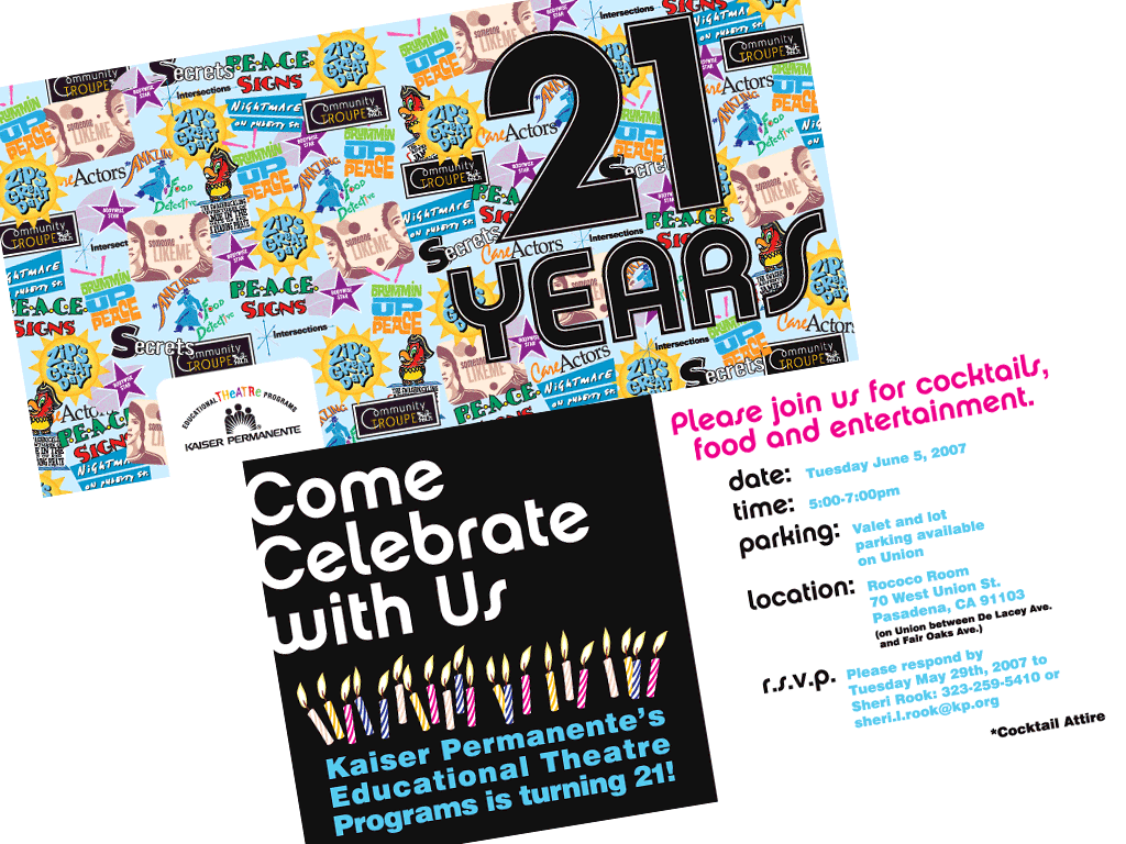 Kaiser Permanente had a theater program to address challenging topics for kids such as bullying, puberty, secrets, accidental pregnancy. The program ranged through various age levels and different topics were geared toward different grade levels. I was assigned to do various illustration and branding for the plays.