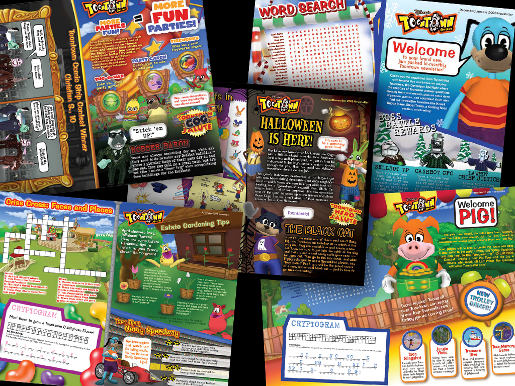 I worked in house and later was hired as a contract Art Director out of house. My biggest projects were designing many interfaces for a project called Disney connection that featured all their properties where people could come and play games in. I also designed countless animated banners which were in Flash so I can no longer show. I also Designed the 100 page players guide for Pirates of the Carribean and ads around property and web interface. Another large project was designing several printed newsletters for Toontown and working in their 3-d robot toon manager posing characters for spreads.
