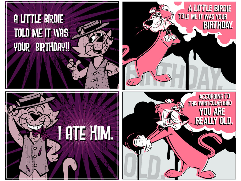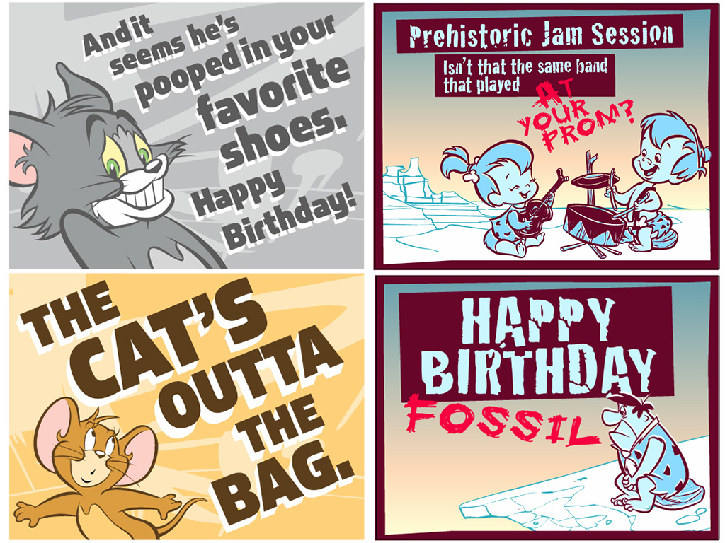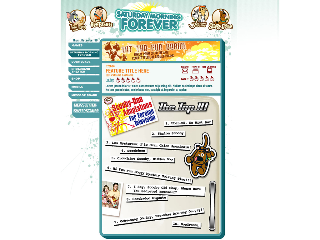 Warner Brothers was one of my favorite animation jobs. The animators and designers were all so talented and the properties were a blast to work with. Most of the animations being in Flash I can't show but I was hired mainly to work on animated ecards of which I have included some stills. Also there was a section of the website called Saturday morning forever which I was to design interface and content for.